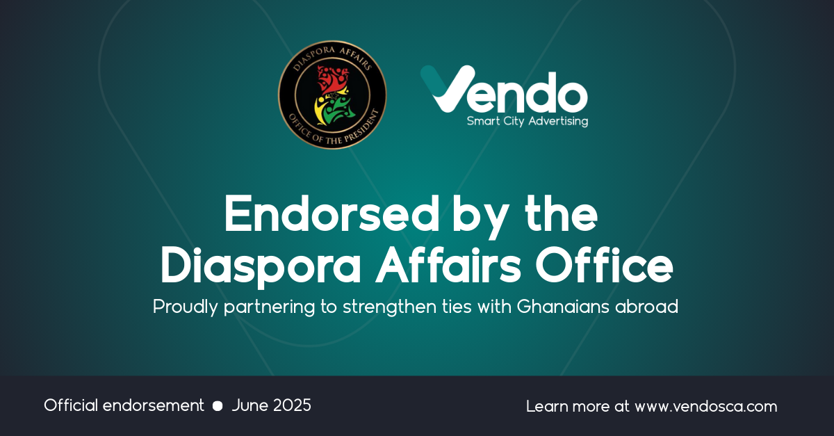 Accra, Ghana — September 10, 2025 The Diaspora Affairs Office (DAO) of the Office of the President of the Republic of Ghana has formally endorsed Vendo SCA (Smart City Advertising), recognizing the company as a recommended service provider for outdoor advertising and marketing solutions.